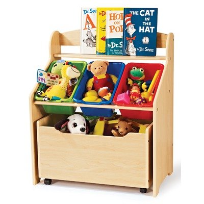 - Includes 1 large rolling toy box, 3 rugged plastic bins in red, green and blue, 1 book/display shelf unit